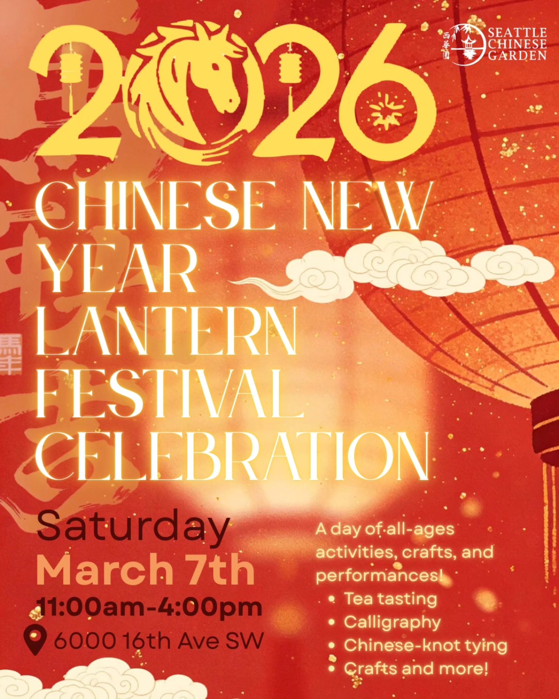 The Seattle Chinese Garden has announced an upcoming event to celebrate 元宵节, or the Lantern Festival, on March 7th. The festivities, which mark one full lunar month since the start of the New Year, are scheduled to begin at 11:00 AM and will feature a variety of all-ages activities. The Garden is located at 6000 16th SW.