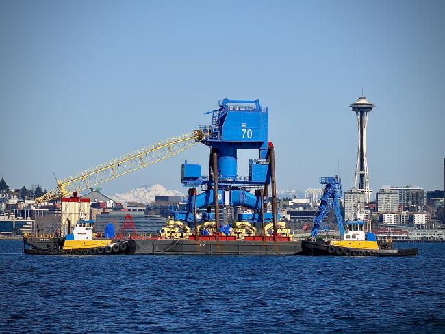 Massive "Big Blue #70" heavy-lift crane enters Elliott Bay, bound for Vigor Shipyard