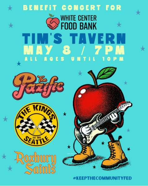 Join us for a White Center Food Bank Benefit Concert at Tim’s Tavern on May 8th. We’ll start off the night with the rock and soul of Roxbury Saints, then we’ll move to the high energy ska of The Kings of Seattle and finish the night with the latin soul and warm-weather music of The Pazific.