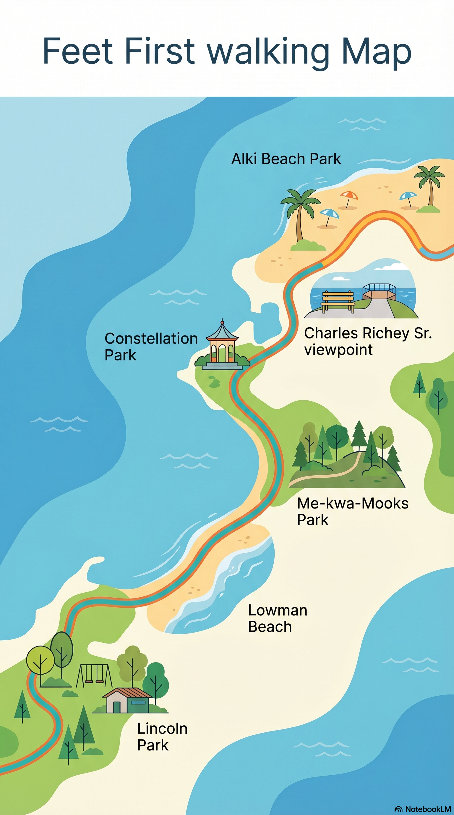 The walk is designed to be accessible and engaging, traversing mostly flat terrain over approximately 90 minutes. The route takes walkers past several iconic local landmarks, including Lowman Beach, Me-kwa-Mooks Park, Constellation Park, and the Charles Richey Sr. viewpoint. Those with a keen eye might even spot Orcas in the Sound before the group reaches its destination at Alki Beach Park.