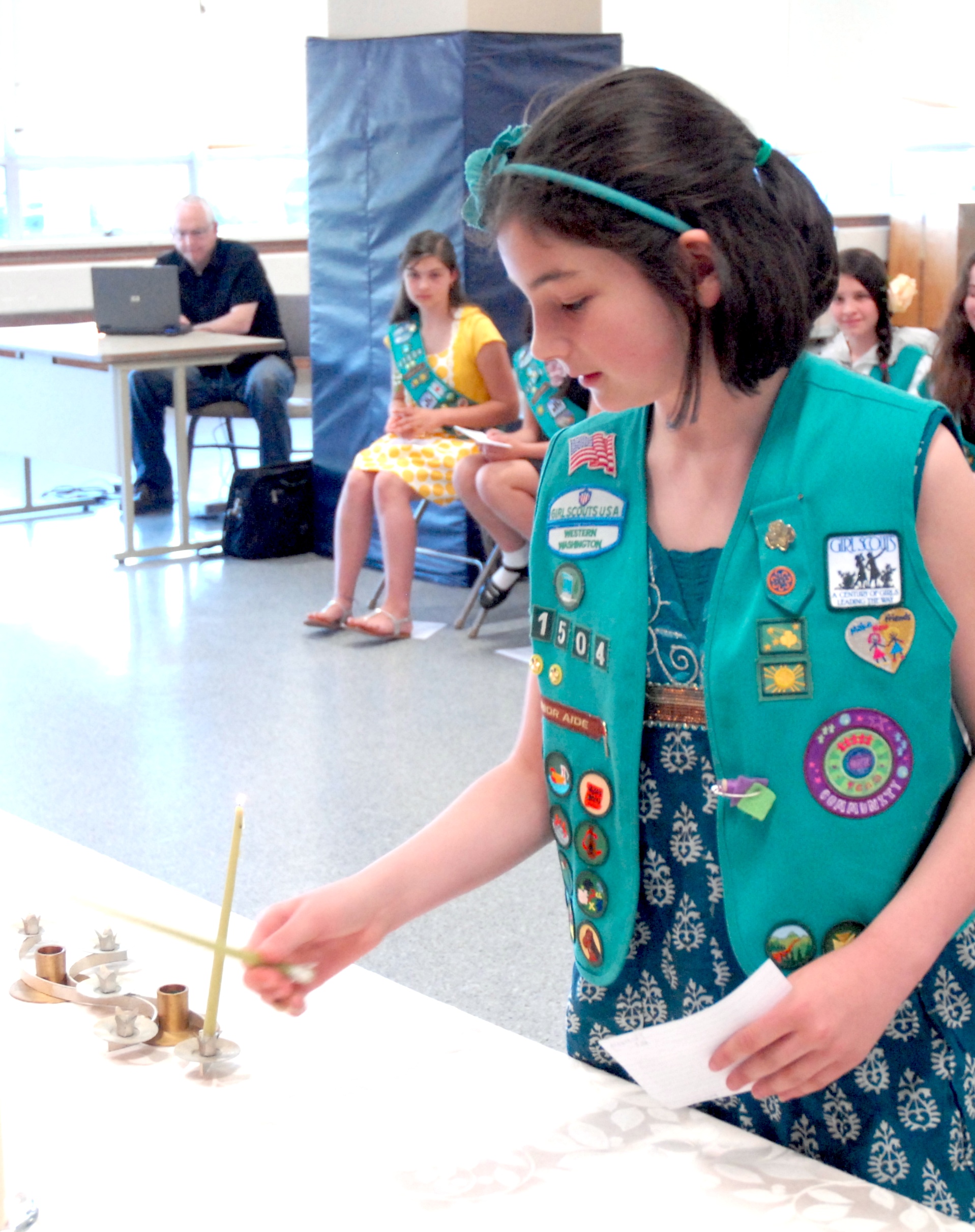 Junior Girl Scout Penny Dierich of Troop 41504 lights a candle before receiving her Bronze Award Friday at Our Lady of Guadalupe School. She joined six other scouts.