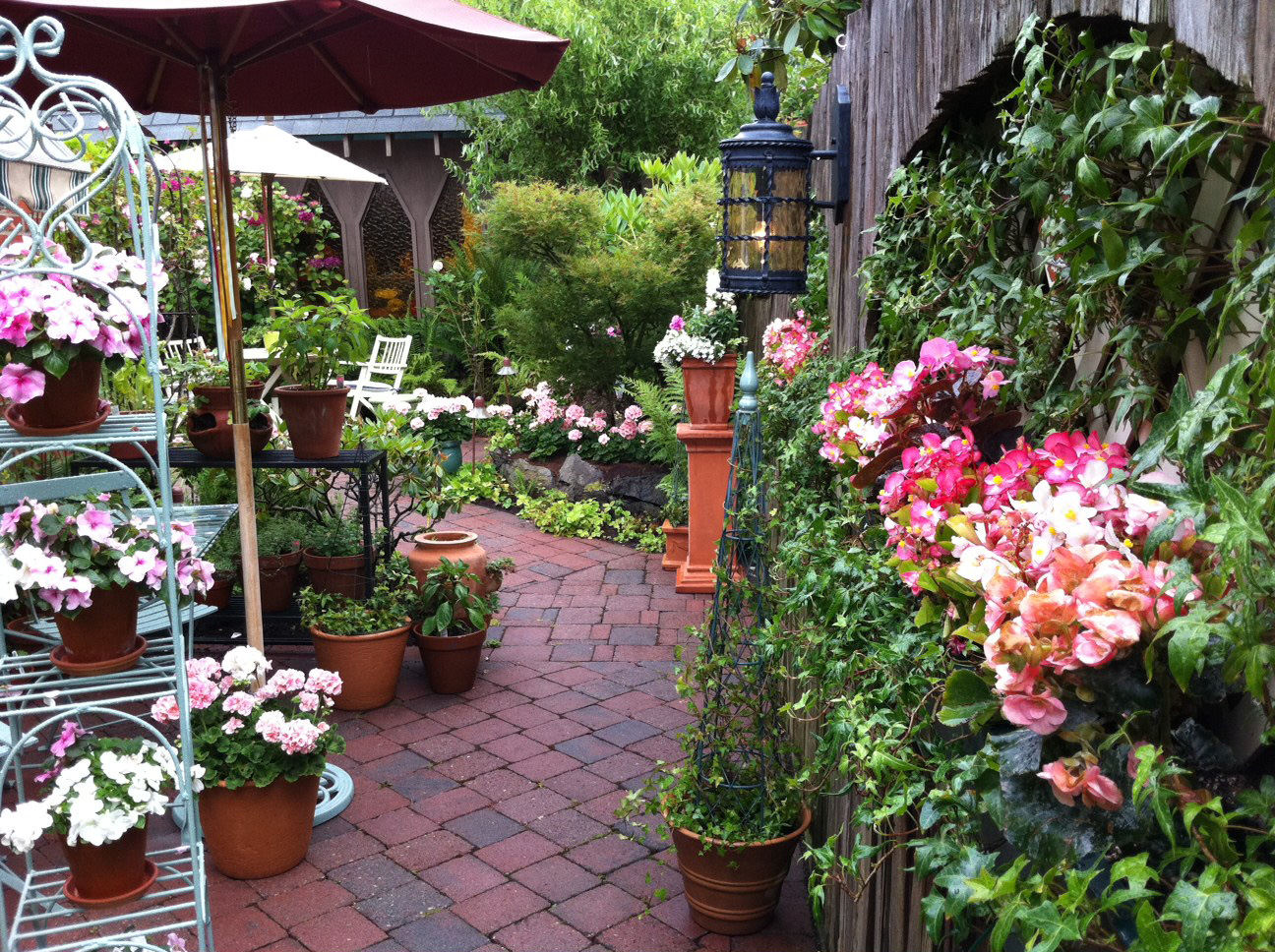 This french themed, ten year old garden also on Fauntleroy Way s.w. was inspired by the Bel Air Hotel in Los Angeles and has a brick courtyard under a balcony. The topiary here gives it the sculptural identity and the garden contains David Austin roses, lavendar, herbs tomatoes, hydrangeas, and lots of ivy and boxwood.