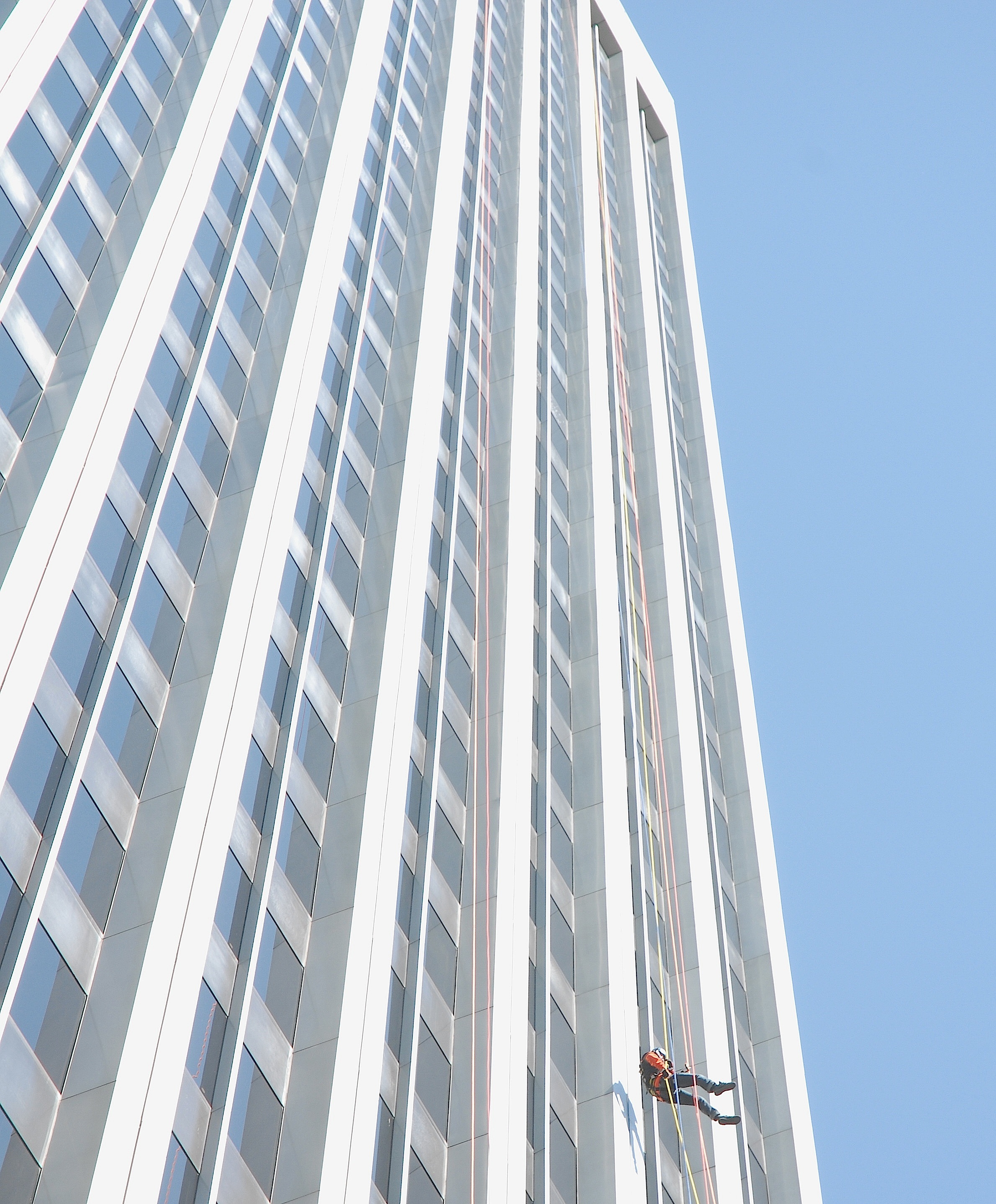 West Seattle residents Mike Gutt, pictured top, and Mike Powell, pictured lower left, rappel Rainier Tower, 1301 Fifth Ave., for the Special Olympics' 2nd annual "Over the Edge". They are colleagues with K2 Sports that co-sponsored the event. They helped organize and operate it as nearly 200 will rappel the tower this weekend to raise over $200,000 for the charity. Columbia Center, pictured rear, left. CLICK ON PHOTO FOR SLIDESHOW.
