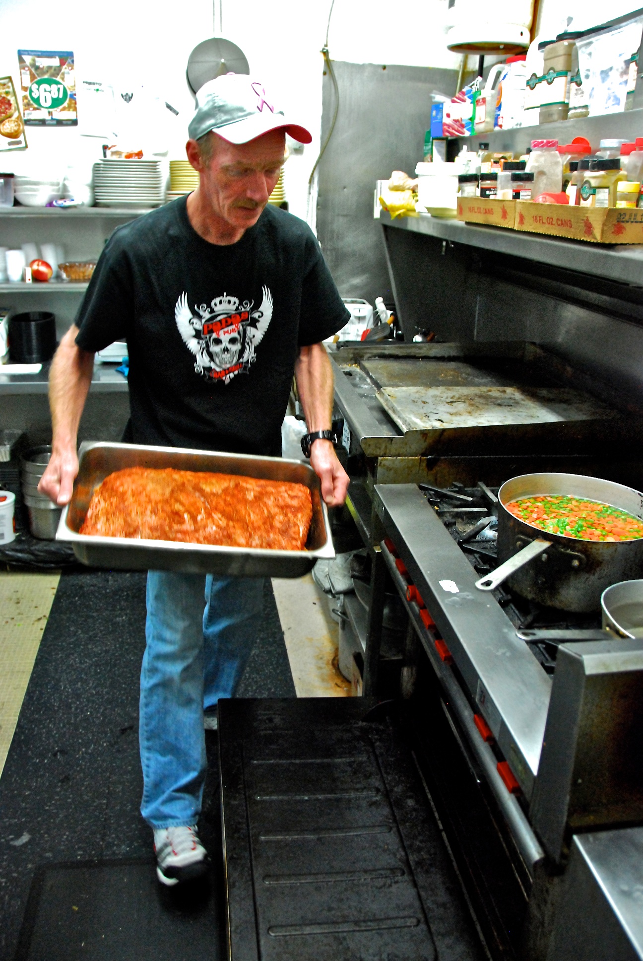 Wednesday through Saturday Texas Hold'Em is played and starts at 6:30 p.m. and their food. He's especially proud of the Prime Rib dinner with a baked potato veggies and roll for $9.50. They open at 9 am and serve breakfast. They have a lunch menu with hamburgers and deli sandwiches, and weeknights they have a dinner special with items like Chicken Fettucini, Pan Fried pork chops and the Prime Rib on Thursdays. They are bringing in dart boards to add to their game selection (one of which is a punching bag where you can test your strength, a potentially useful outlet for people more testosterone than they can handle.