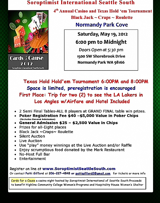 Preregistration for the Texas Hold’em tournament is recommended by contacting Patti Gifford at 206-227-4848 or pattigifford2@gmail.com, or go online to SoroptimistSeattleSouth.com.