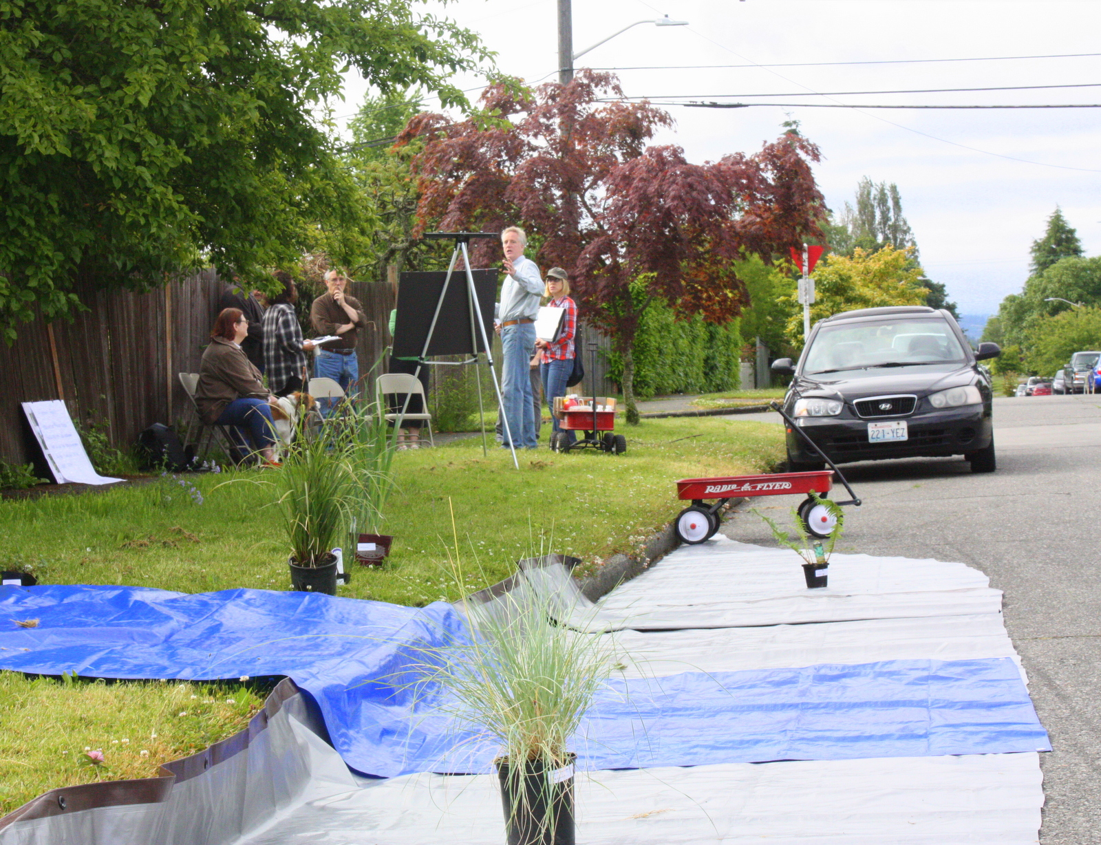 Residents of 30th Ave S.W. talk with King County on June 23 about the upcoming conversion of their block to a series of bioretention swales (similar to rain gardens) in an attempt to reduce sewage/rainwater overflows into Puget Sound. In the foreground is a tarp illustrating curb bulbs to be installed and flora options to be planted.