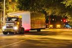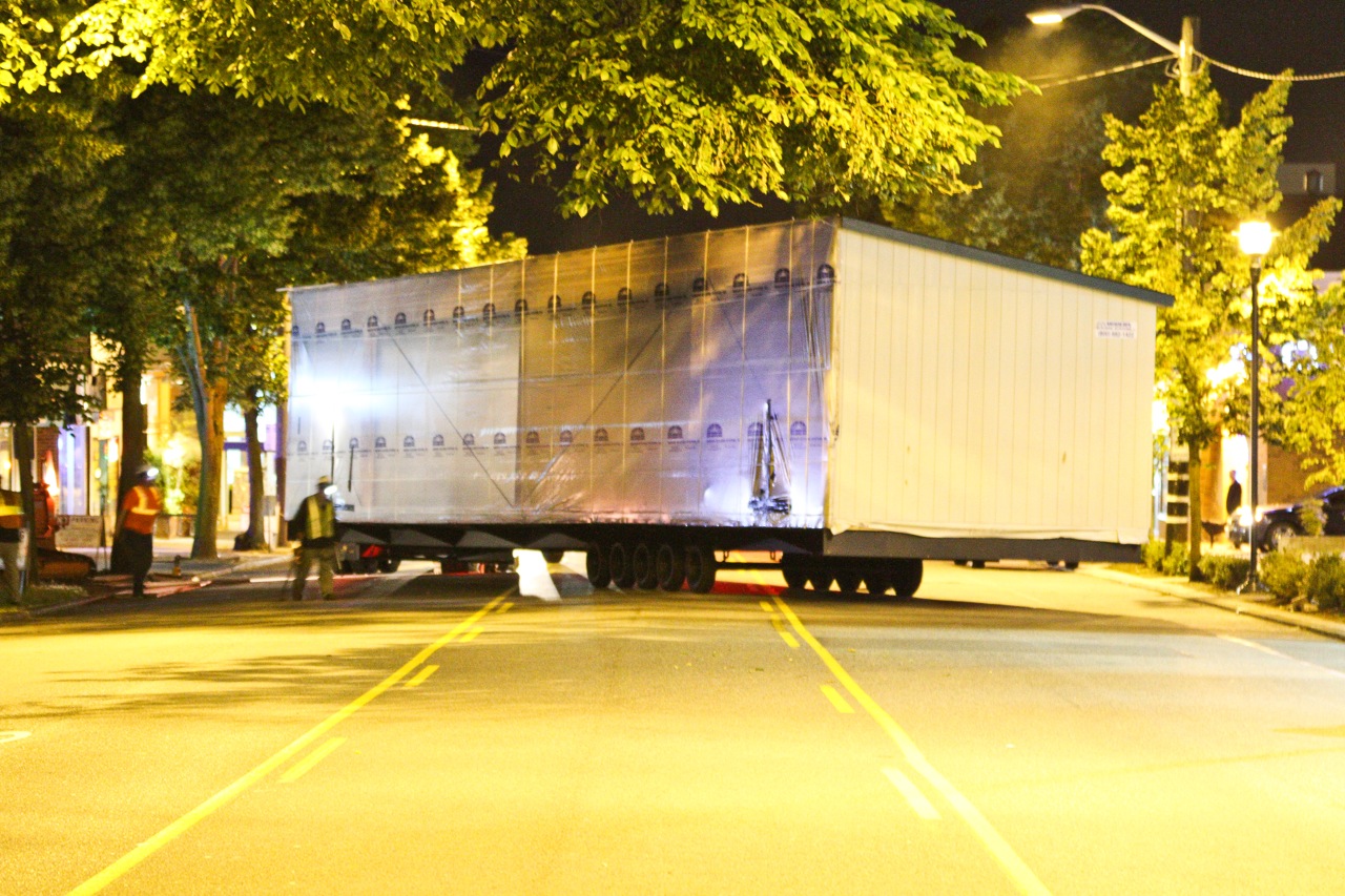 Chris Tyler, Operations Manager for the Washington State Division of Modern Building Systems said they were contracted by the Seattle Public Schools to install 13 of the portables throughout the school district. "To make it work with everybody's schedule we do it at night. So it's just a matter of making it fit down this little alley. We've got about six inches to spare on each side of the building so it's a matter of crawling and taking our time."