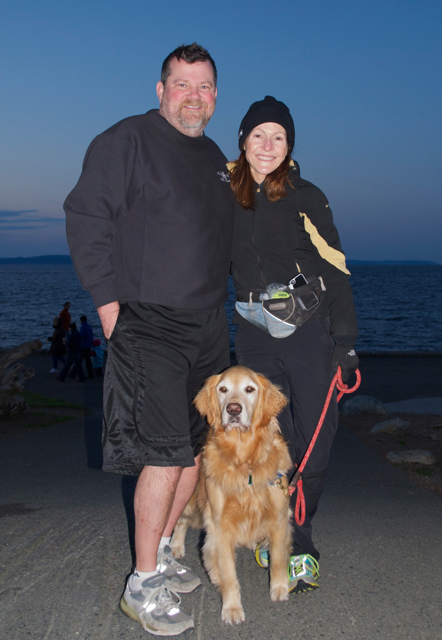 Seamas and Trish Markey with their dog Lola on on Alki. Lola is VERY interested in squirrels, birds, really almost anything that moves and when she spots one, you better hang on!