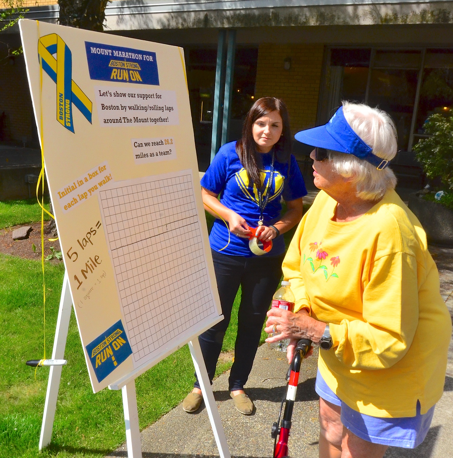 Residents, staff and volunteers took part in the Mount Marathon, showing support for the people and city of Boston with a walk around Providence Mt. St. Vincent on Thursday April 25. Each lap added up to the total with the initial goal of 26.2 miles, the distance of a marathon, and a larger goal over the next few months of 3048 miles, the distance from Seattle to Boston.