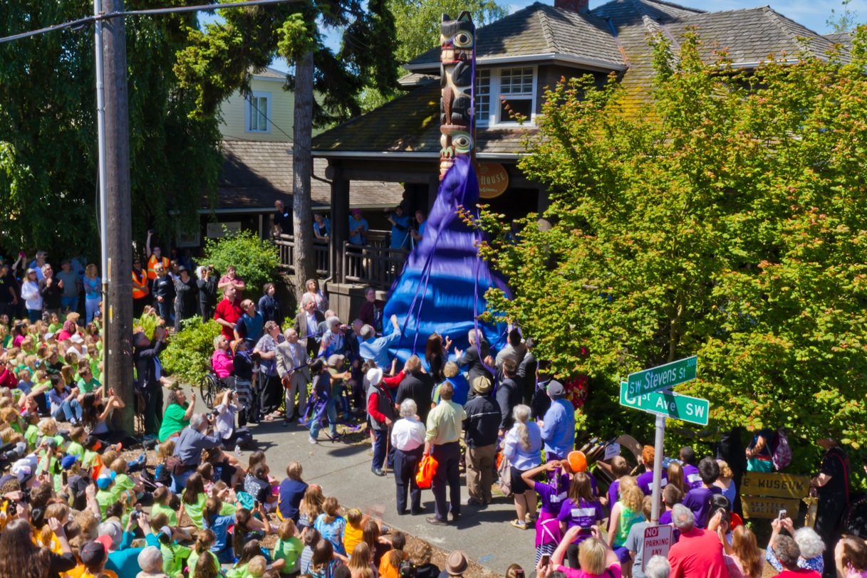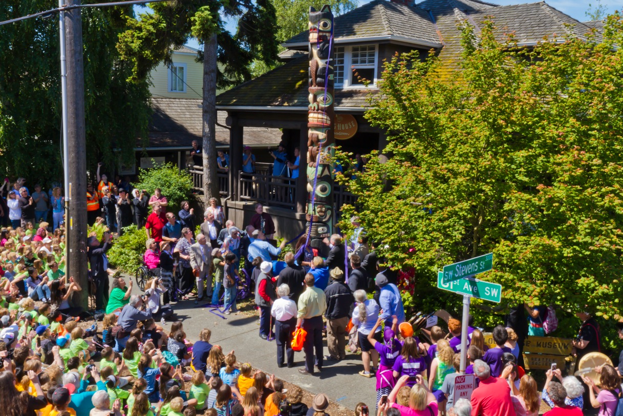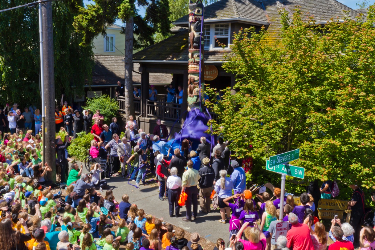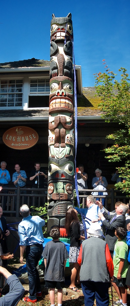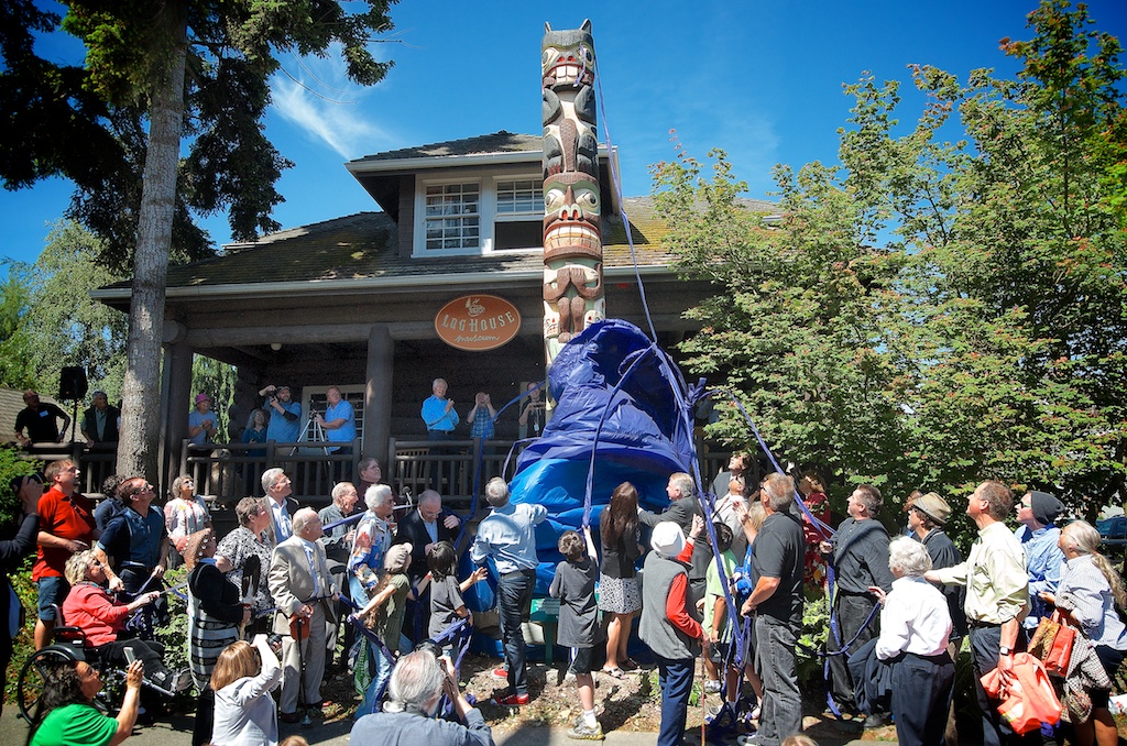 The restored Admiral Totem Pole was unveiled by a a group of dignitaries and school children at a special ceremony at the Log House Museum in West Seattle on June 6.