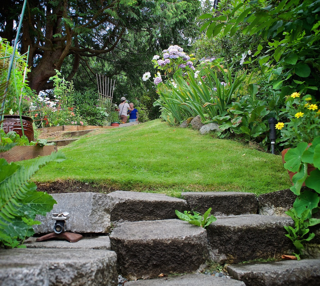 Expansive and steep, the beauty of this inspiring hillside belies the vision, energy and tenacity of the gardener who preserved the beautiful big leaf maples and cedars, added native species, removed a hillside of blackberries and built a winding stairway from the house to the street below. It took 10 years.