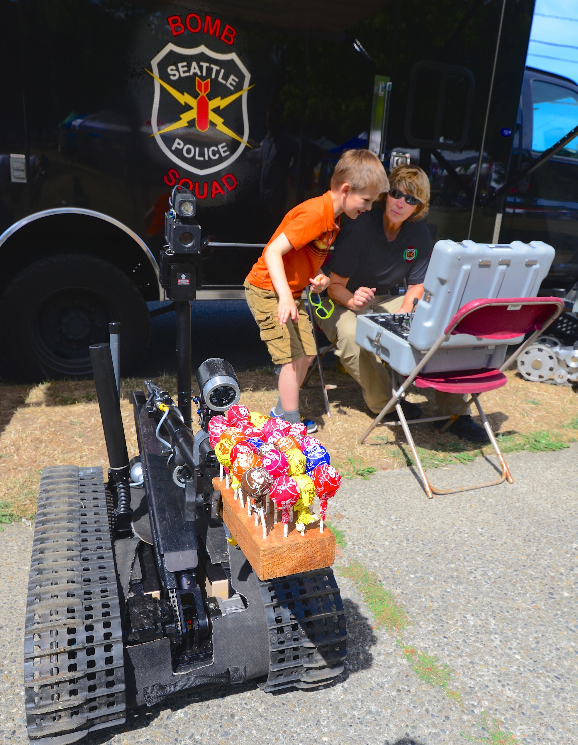 Also on hand for the police were the mounted patrol officers who brought two horses Justice and Dozer to visit with people attending, the SWAT vehicle and officers, the Seattle Police Bomb Squad showing off their radio controlled robot, and Dennis the bomb sniffing dog.