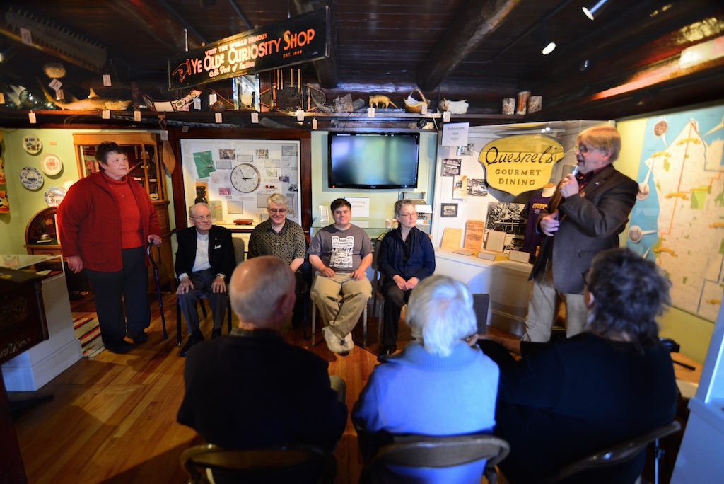 During the October 2014-June 2015 closure of Ye Olde Curiosity Shop on the downtown waterfront due to city seawall reconstruction, the Southwest Seattle Historical Society is hosting a focus-area exhibit on the long time Seattle waterfront attraction. At a special presentation on Friday Oct. 24 members of the James family who have owned the shop for decades were in attendance at the Log House museum to recall memories and answer questions. Representing the family were Joe James, Andy James, and Neil James.