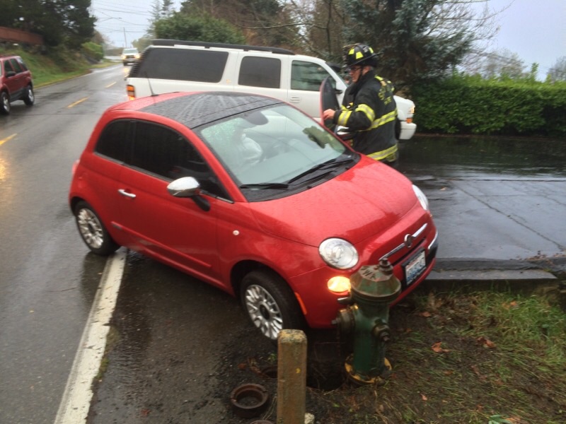 A two car accident on Marine View Drive resulted in a very close call for on driver. A small red car and a large white passenger truck collided around 3pm near 46th SW.. The red car travelled north and hit a fire hydrant but just barely missed heading what would have been an approximately 25 foot embankment to a driveway below. The adult female driver of the small car was not hiurt.