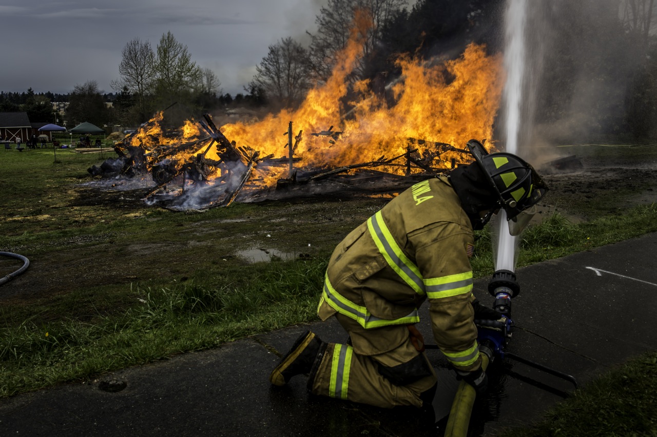 Firefighter Cadets Spray down a house used in a live fire training located at 10653 4th Ave SW on March 19.