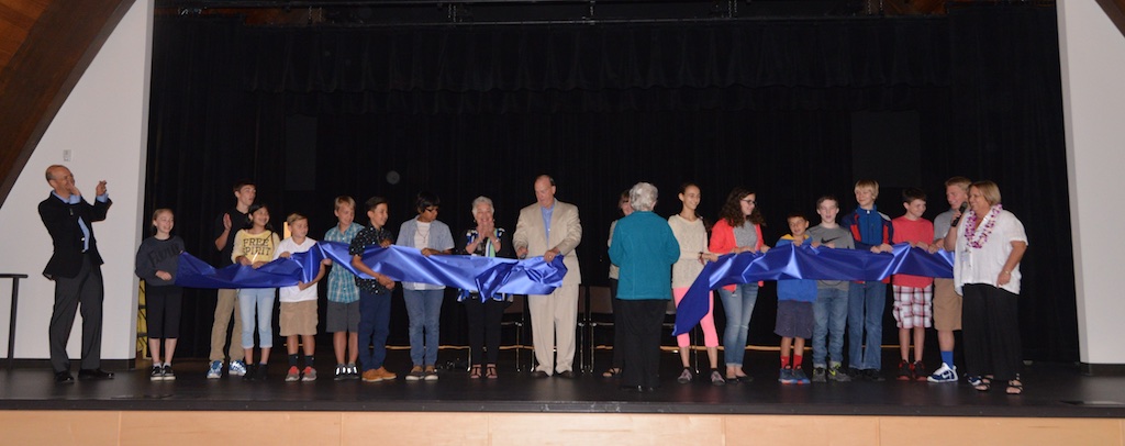 Current 8th Grade students were joined by all the former Heads of School and the school's Founder Alice Howell in cutting the ribbon on stage at the school.