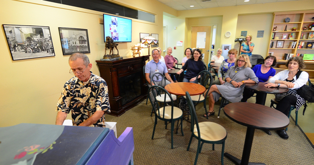 Following an 11 a.m. piano delivery, the Senior Center of West Seattle’s own Michael Harris hosted a sing-along with center members. Harris was ArtsWest’s Executive Director from 2000-2005 and was in the original cast of HAIR on Broadway in 1968.