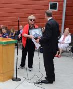 A special "last flag" to fly over the former Schmitz Park was presented to Vicki Schmitz by Oliver and Maya Smith.